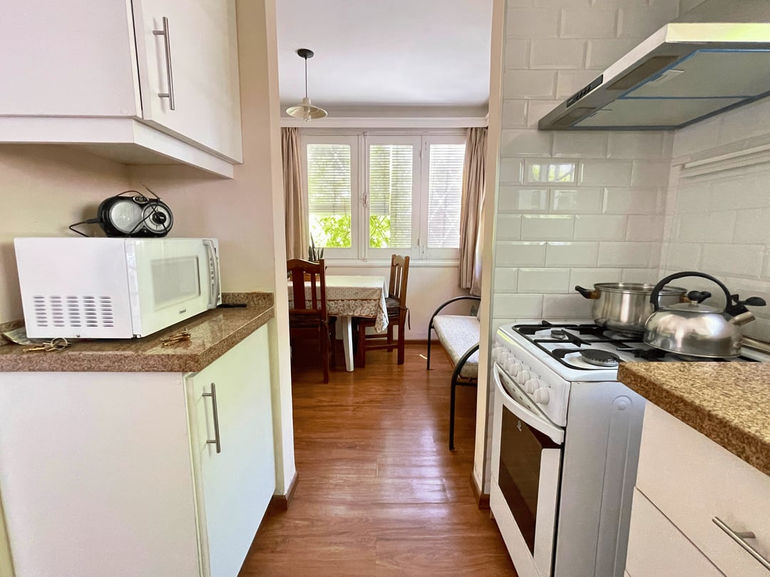 Living comedor con cocina integrada, toilette, escritorio, dos dormitorios y dos baños completos.