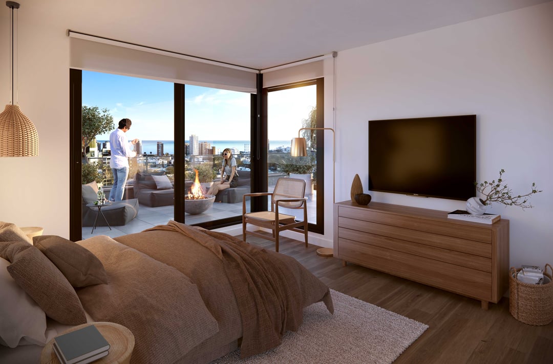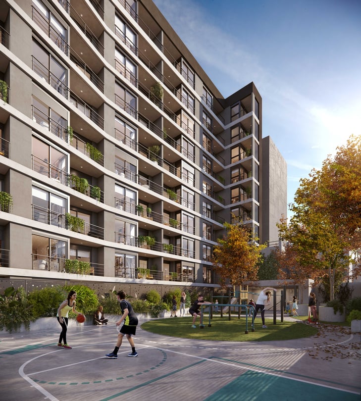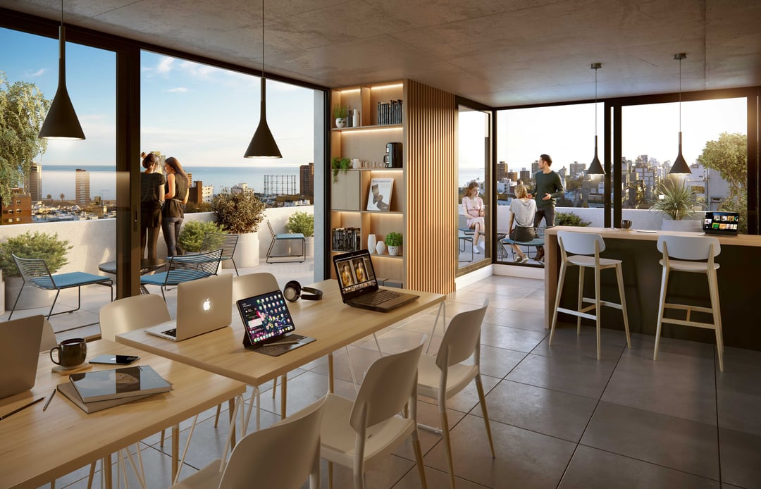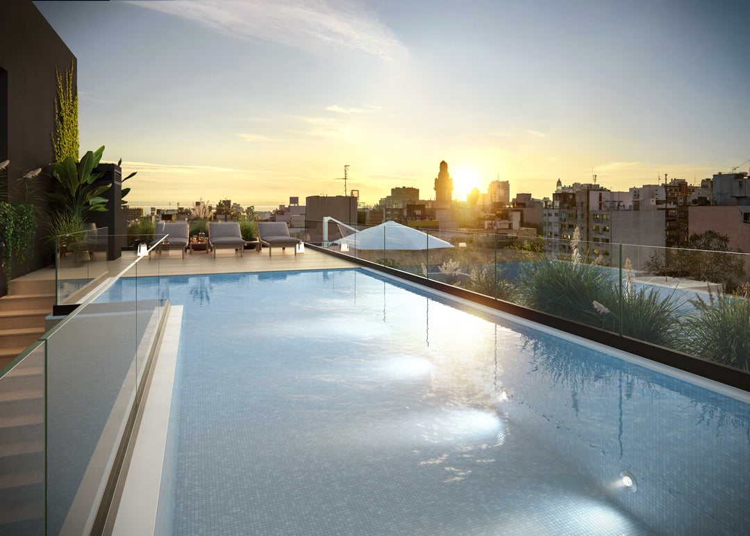 Amenities y servicios: Piscina con vista panorámica, Deck solarium, 2 barbacoas con cocina y parrilla, barbacoa exterior con pérgola, área de juegos para niños, gimnasio con maquinas de ultima generación, terraza zen con fire pits, equipamiento para ejercicios de calistenia, laundry con app, bici-parking, pick-up lockers, sistema CCTV, área exterior con cancha multideportiva, mostrador de recepción y co-work con estación de servicios y mesa colectiva.