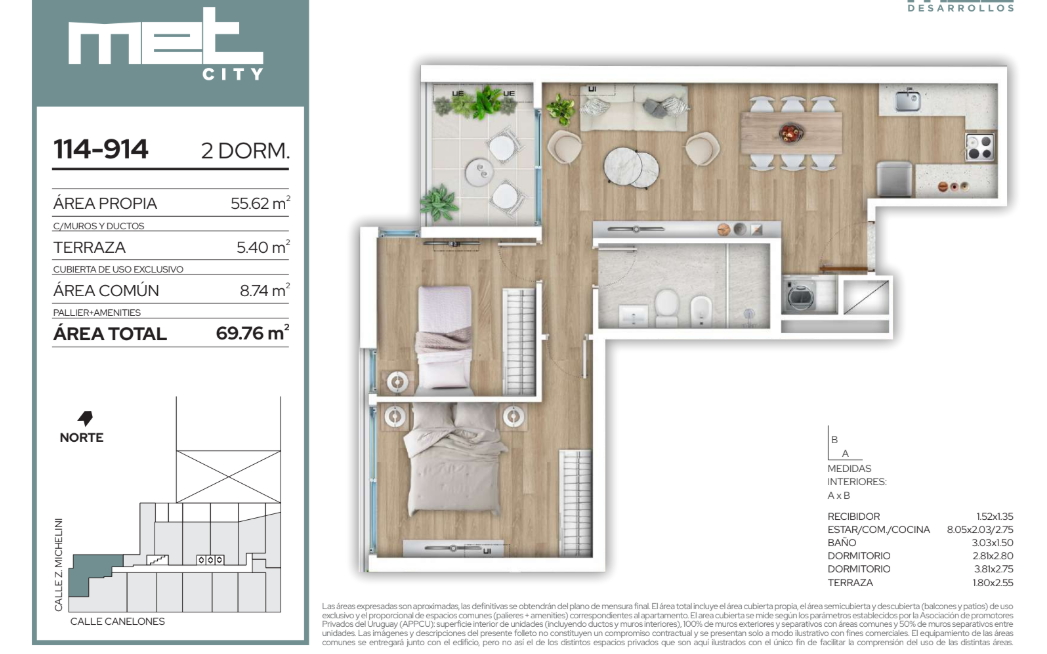 Venta de apartamento de 2 dormitorios en Met City, Centro, ubicado en Canelones, entre Héctor Gutiérrez Ruiz y Zelmar Michelini, en una zona hiperconectada, donde te facilita la logística cotidiana, con todos los servicios a mano y a su vez muy cerca del escape de la Rambla.