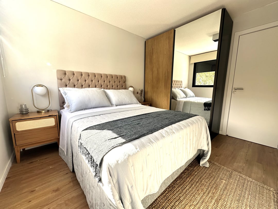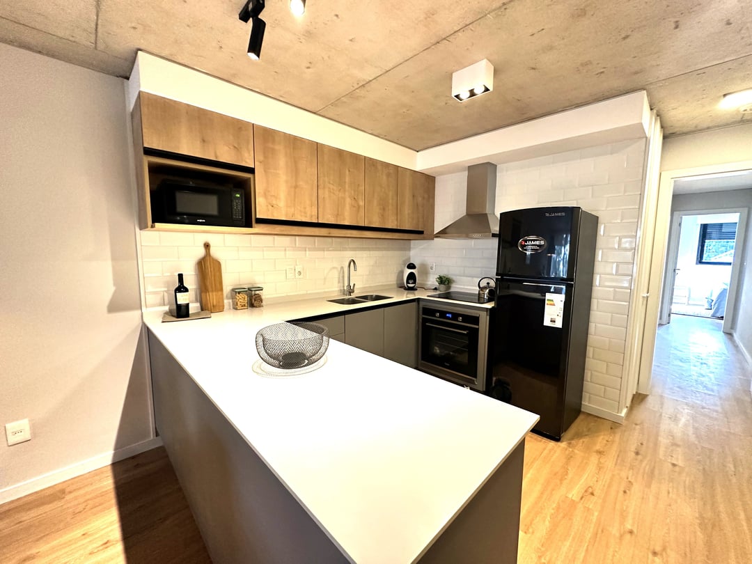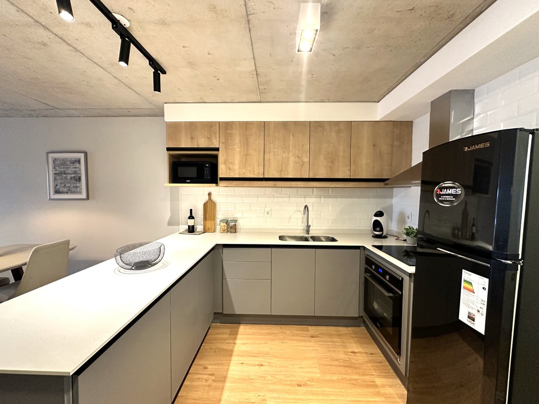 El edificio es de 10 pisos, moderno y de diseño, combina materiales como hormigón visto, revestimientos símil madera y hierro negro en barandas.